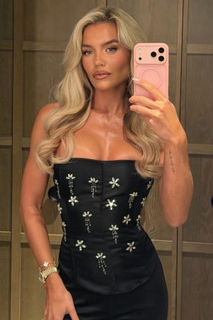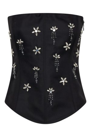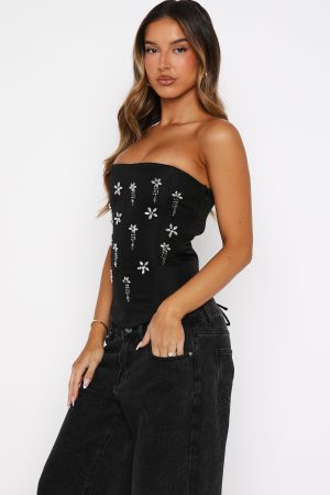 Capture every angle in the Damned Heart Embellished Bustier in Black! Features a strapless neckline with grip tape support. internal boning down the bodice for structure. and shimmering rhinestone embellishments. Finished with a corset‑inspired lace‑up back. a side zipper with hook‑and‑eye closure. and fully lined for ultimate polish. Style with your go-to denim jeans. layered gold jewellery and kitten heels for all eyes on you.