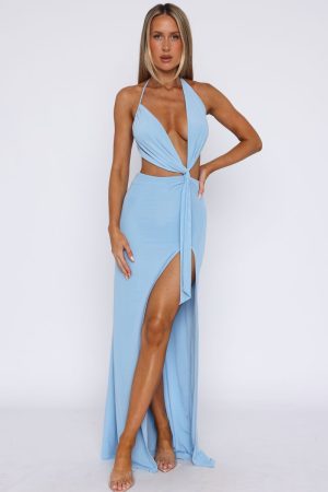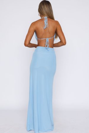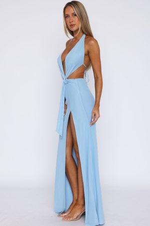 Float through your next special occasion in our Dance With Me Maxi Halter Dress in Powder Blue. Features self tie halter straps. plunge neckline. cut out design on waist. elasticated waistband with tassel detailing side front. leg split side front for ease of wear and self tie back straps to provide bust support. Team with heels and simplistic jewellery to let the dress speak for itself!