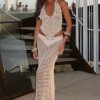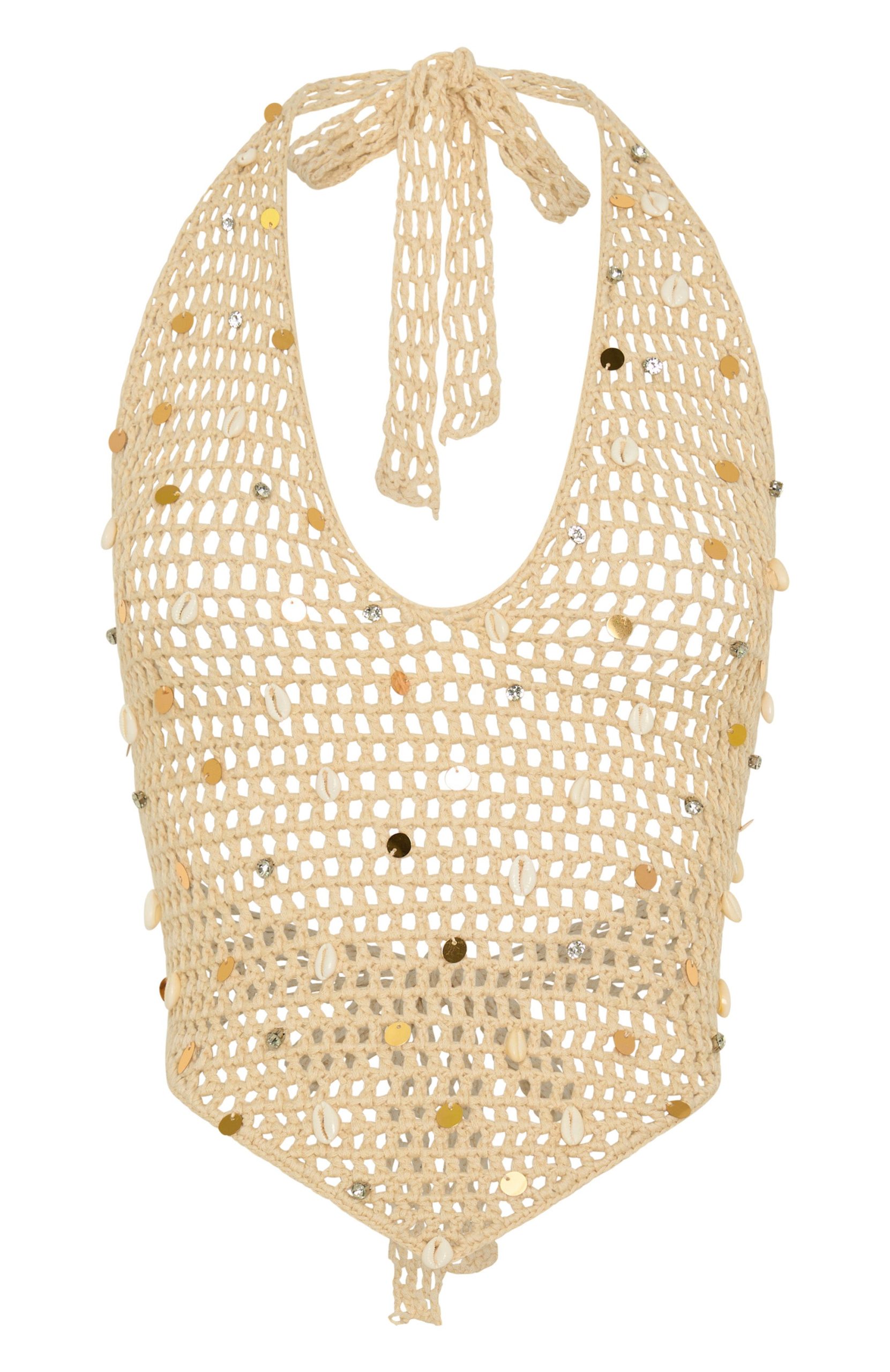 Dive into summer bliss with the Dance With You Crochet Top Sand. Features halter neckline with self ties. back ties for additional support. v-hemline and shells and sparkles scattered over fabrication. Complete the look with the matching Dance With You Crochet Maxi Skirt for a summer look we love!