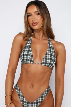 A simplistic but classic bikini set is a must have for any summer holiday! The Danica Bikini Top in Forest Plaid features features a triangle silhouette. flattering halter neckline and self-tie closure at the back. making it as stylish as it is versatile. Pair with the matching Bottoms in Forest Plaid. sunnies and shoulder bag for a look we love!