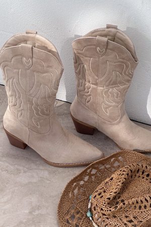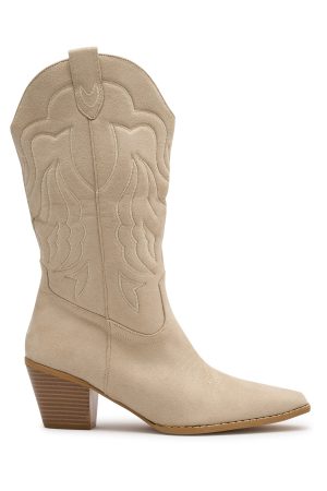 The Darcy Cowboy Boots Nude are perfect for adding a playful edge to any outfit! Featuring a multi toned tan boot and statement cut-out design. mid block heel. closed pointed toe and side pull tabs for an easy slip on design.