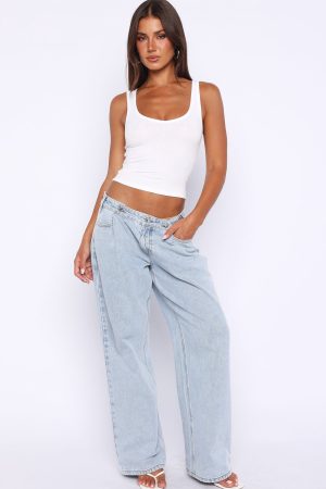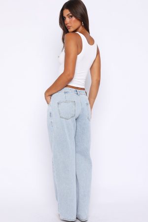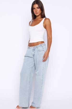 Turn heads in the Day At A Time Low Rise Wide Leg Jeans in Mid Blue. Featuring a button-and-zip closure. adjustable waistband with button detailing. belt loops. and classic 4-pocket design. Finished with a faux leather embossed White Fox label at the side back. these low-rise jeans flaunt a relaxed wide-leg silhouette. Style with a going-out top and kitten heels for an elevated denim look.