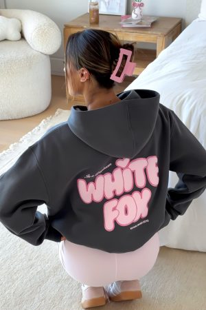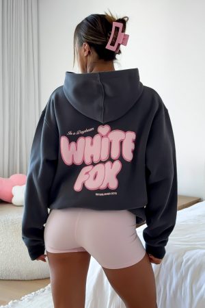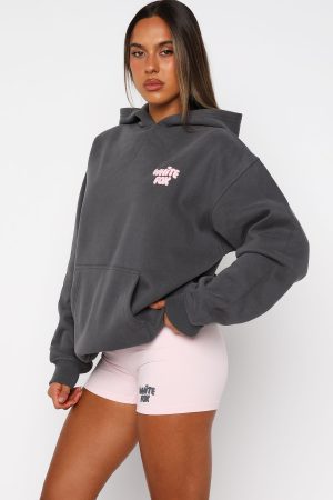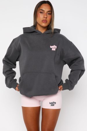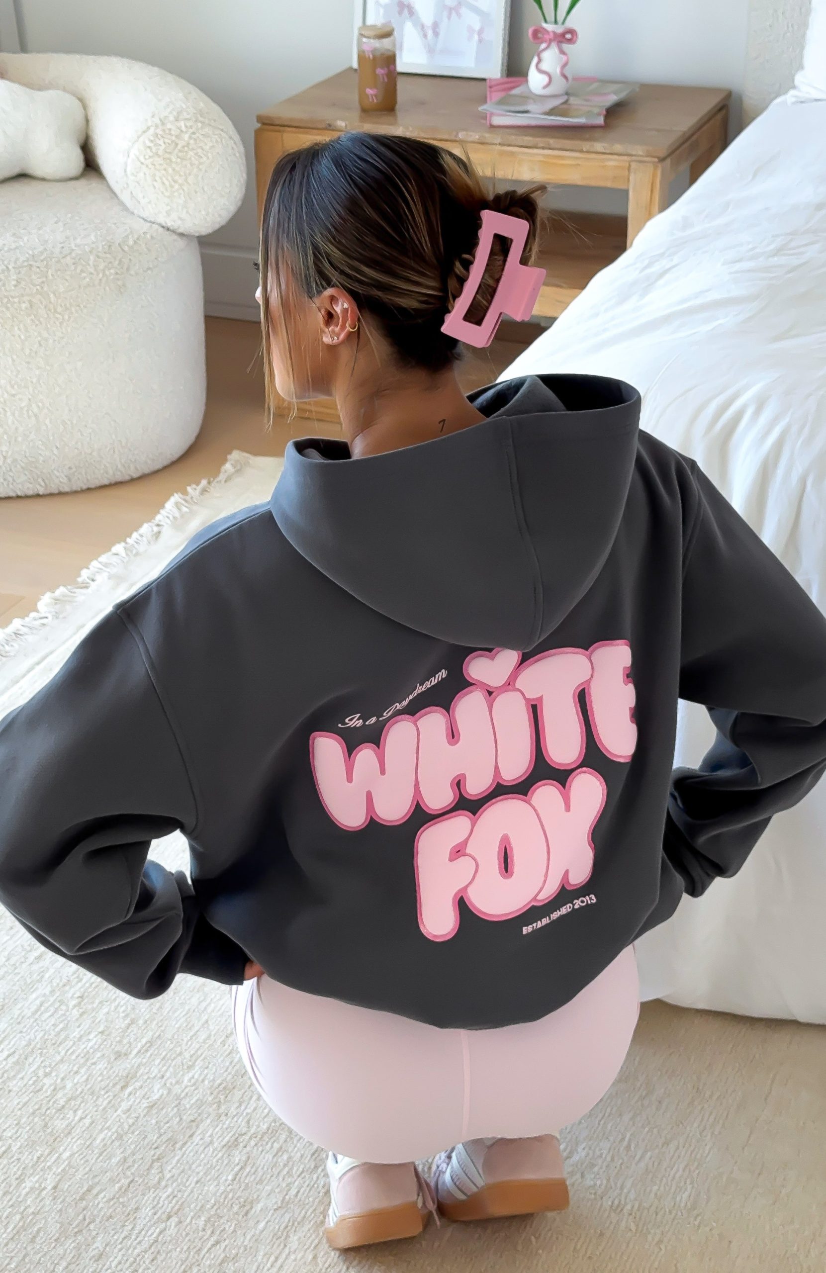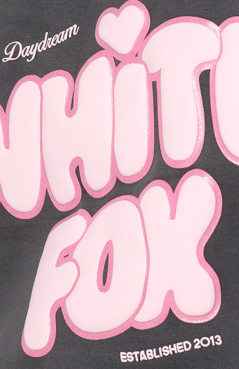Introducing the Daydreamers Angelina Oversized Hoodie in Volcanic. where staying in becomes the main event. Designed with a relaxed hood. drop shoulder design. side front and centre back puff print logo with glitter outlining detail and ribbed hems which round out to an oversized silhouette. Featuring long sleeves. a roomy front pocket. and an unlined fleece interior. this hoodie delivers a cozy feel. Pair with the matching Daydreamers shorts and your fave sneakers for a cute and cozy look.