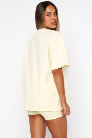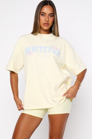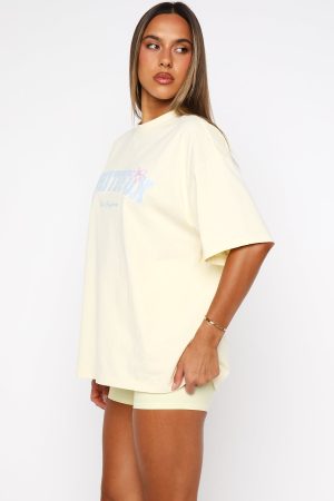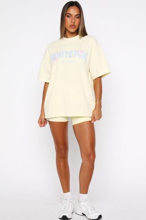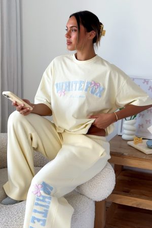 For when you want to look like the main character… even on the couch! The Daydreamers Madeline Oversized Tee Lemon is tailored with a classic crew neckline. relaxed slouched shoulders. breezy short sleeves and relaxed silhouette. Finished off with a White Fox Borg text at the front. Pair with the matching Daydreamers Madeline Wide Leg Sweatpants Lemon for the cutest fit!