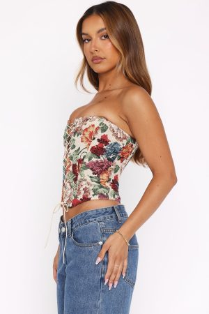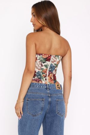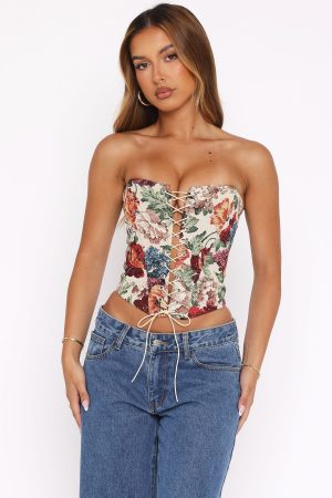 Manifest Mr/Mrs right in the Dear Diary Bustier Floral. Featuring a strapless design. centre front tie up closure. lined. back zipper and clasp closure and cropped length. Style with low waisted jeans and gold accessories for a look that will have hearts racing!