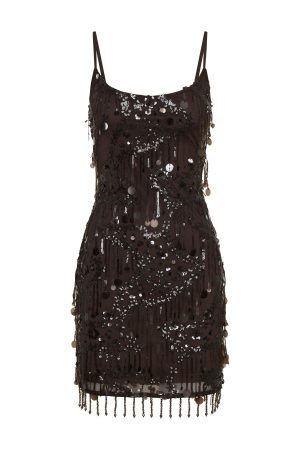 Your birthday. your rules! The Decadent Daze Beaded Mini Dress in Chocolate features dainty adjustable straps. a flattering scoop neckline. and a body‑skimming silhouette. Lush floral sequins and tassel beading on the hem bring playful elegance. and with its fully lined. high‑stretch fabrication. you’ll be glam and comfy all night. Style with statement earrings and kitten heels for an all eyes on you bday fit!
