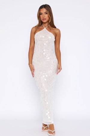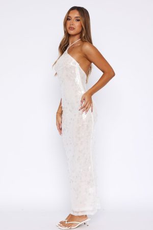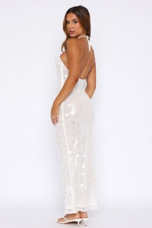 The perfect party dress has arrived! The Dedication Sequin Maxi Dress in White features halter neckline with self tie straps. sequin detailing. visible zipper on side with hook and eye and backless. Complete the look with your favourite kitten heels and gold accessories for a chic look we love!