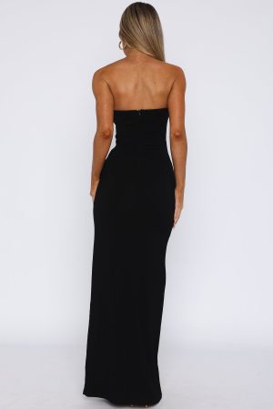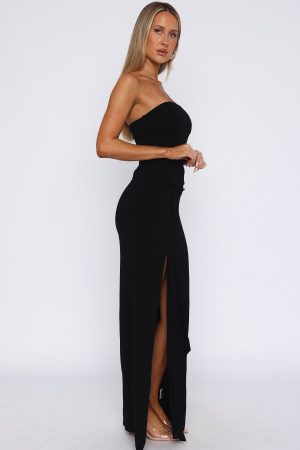 Elegance made comfortable with the Deep In My Heart Strapless Maxi Dress in Black! Features strapless neckline with grip tape. fabrication knot detailing on waistband. side leg split and invisible zipper centre back. Complete the look with simplistic heels and gold jewellery for a look we love.