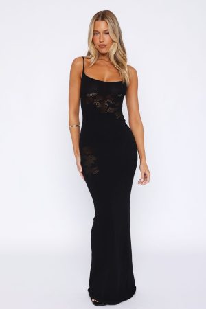 Slip into seaside chic that’s ready to party beyond the sand! The Deep Love Knit Maxi Dress in Black features thin. adjustable shoulder straps. a scooped neckline. maxi length. figure hugging fit. and unlined. stretch material for an easy slip on design. Complete the look with statement heels and layered jewellery for a perfectly styled fit.