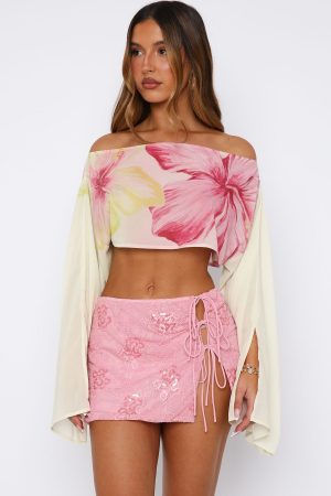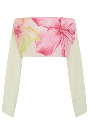 Introducing Desert Drifts Long Sleeve Top in Oasis Bloom. your new go-to for summer getaways! Features a strapless neckline. long sleeves with split on cuff and lined bust. Feel you most summery by pairing with the Goddess You Sequin Mini Skirt Pink.