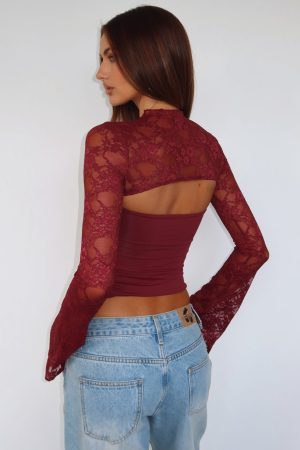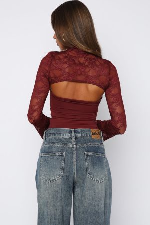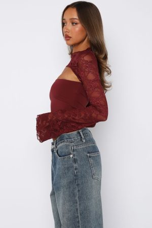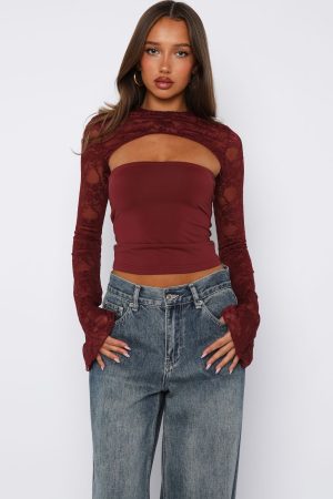 Forever in awe! The Devoted Love Long Sleeve Top in Burgundy features a lace long sleeve overlay and attached strapless top with stretch fabrication for a figure hugging fit. Let the top do all the talking and pair with White Fox denim jeans and heels for a look we love!