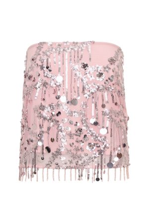 When the invite says ‘dress to impress.’ the Disco Baby Beaded Mini Skirt in Baby Pink nails the brief. Featuring a thin waistband with side zipper and clasp closure. mesh-lined material. mini length and paillette sequin embellished material for a high shine finish. Style with a basic white tank top to let the skirt do all the talking!