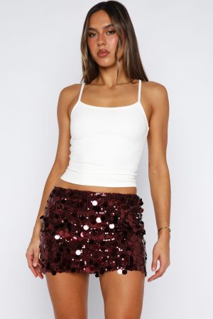 Turn heads in the Disco Fever Mini Skirt in Burgundy. a low rise stunner crafted from dazzling sequins with a sleek centre back zipper and soft mesh lining. Pair it with a flirty top and boots. and you’re all set to hit the dance floor and own the night!