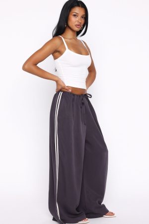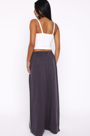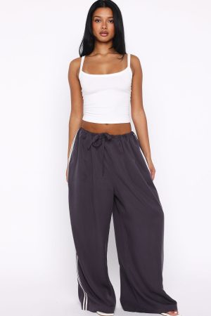 Escape into weekend elegance. The Distant Memories Pants in Charcoal marry a slim drawstring waist with a relaxed wide-leg silhouette in lightweight. unlined fabric. A subtle double-stripe detail down each side injects a hint of sporty sophistication. Pair with a basic tank. sandals and sunnies for a chill weekend fit.
