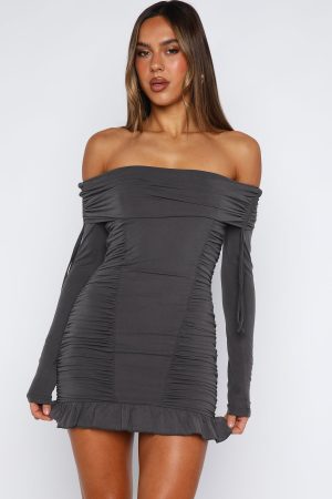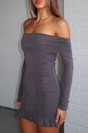 A moment for the Diva Code Mini Dress in Charcoal! Features a strapless neckline with grip tape providing support and long sleeves for seasonal wear. A fold over bust detail with drawstring ties add texture. while the fitted silhouette and high-stretch. lined fabric ensure comfort. Style with boots and layered gold jewellery for a fab fit!