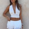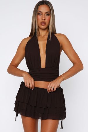 The Dolce Dreams Halter Top in Chocolate is the definition of sweet and flirty! Features self tie halter straps. low plunge neckline and ruched detailing on bodice hemline. Embrace the sweetness by pairing with the matching Dolce Dreams Mini Skort in Chocolate.