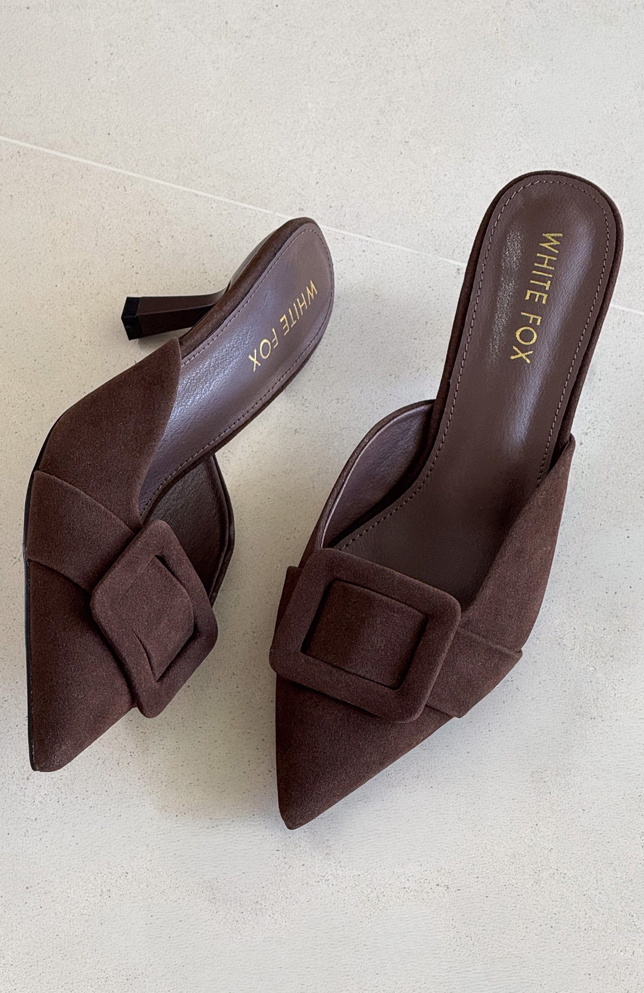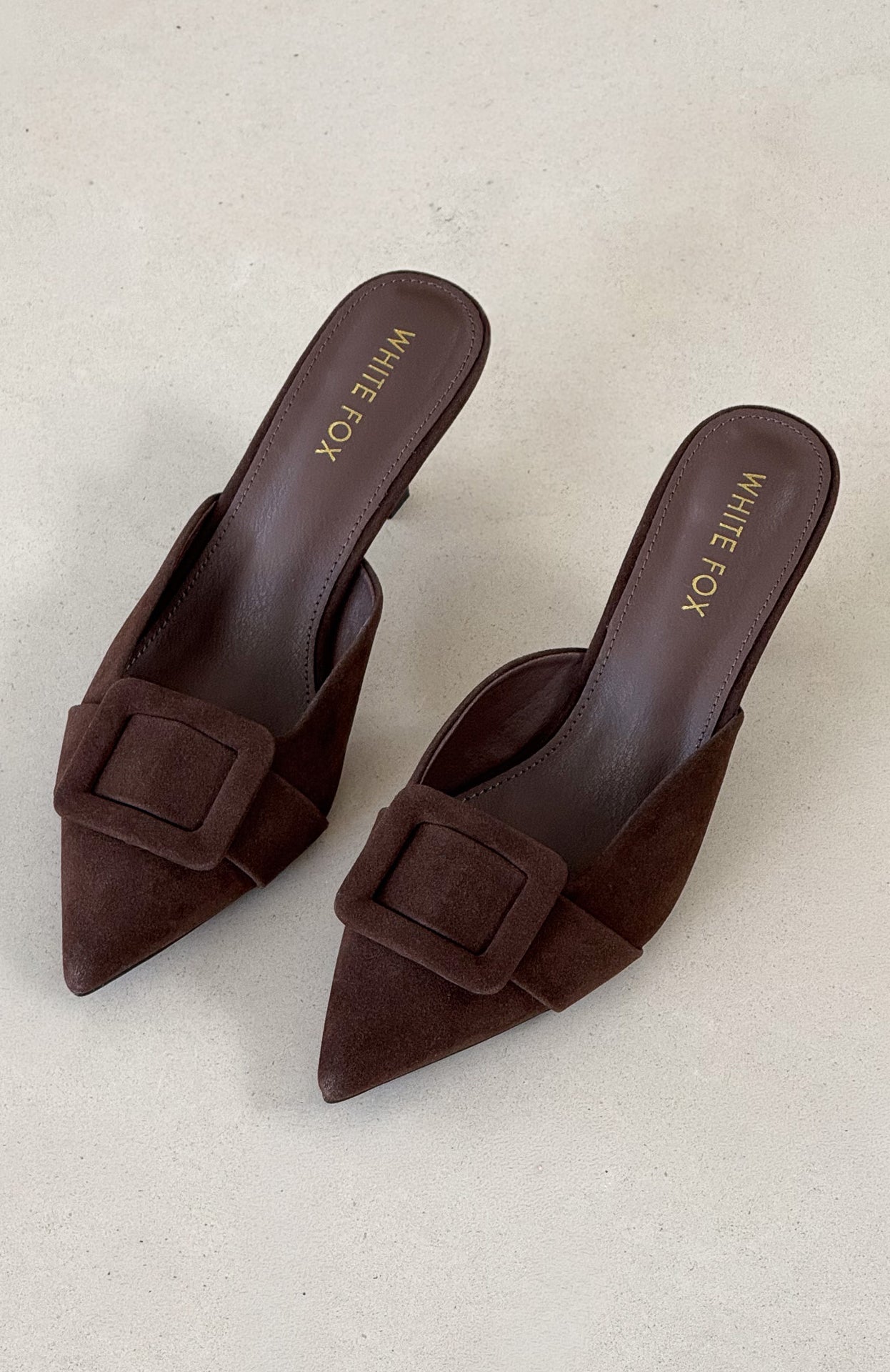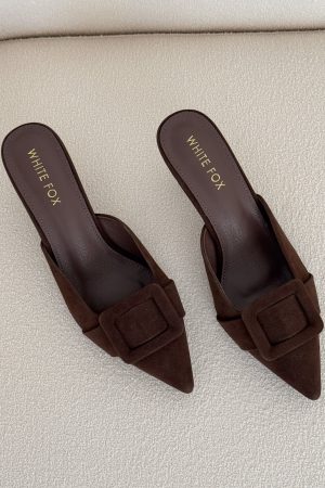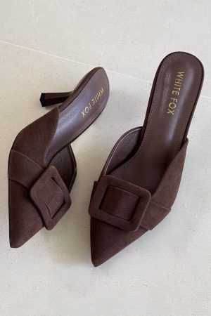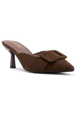 The ones who know. wear them. The Domino Heels in Chocolate Faux Suede feature a pointed closed toe. open round heel. and an oversized buckle at the front atop a chic kitten heel. Style them with denim and a statement top for an effortlessly elevated look.