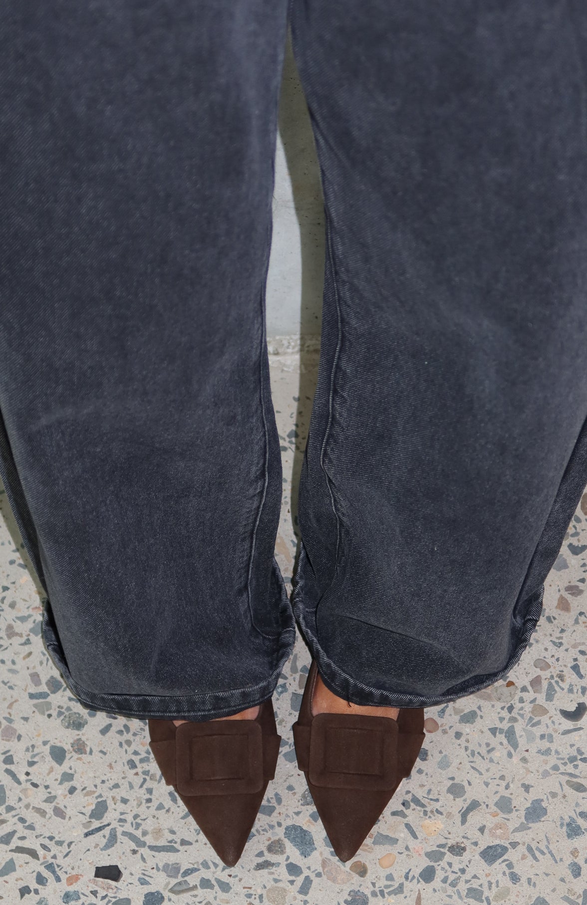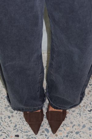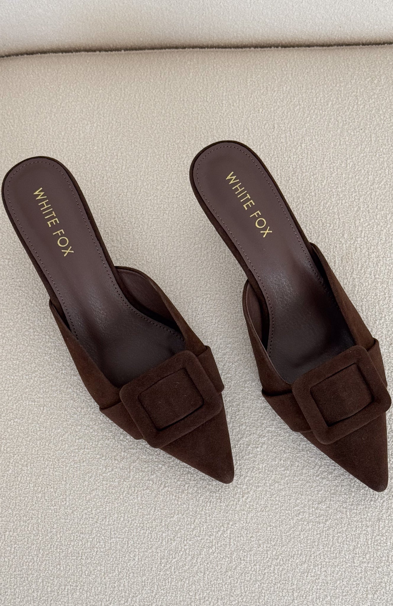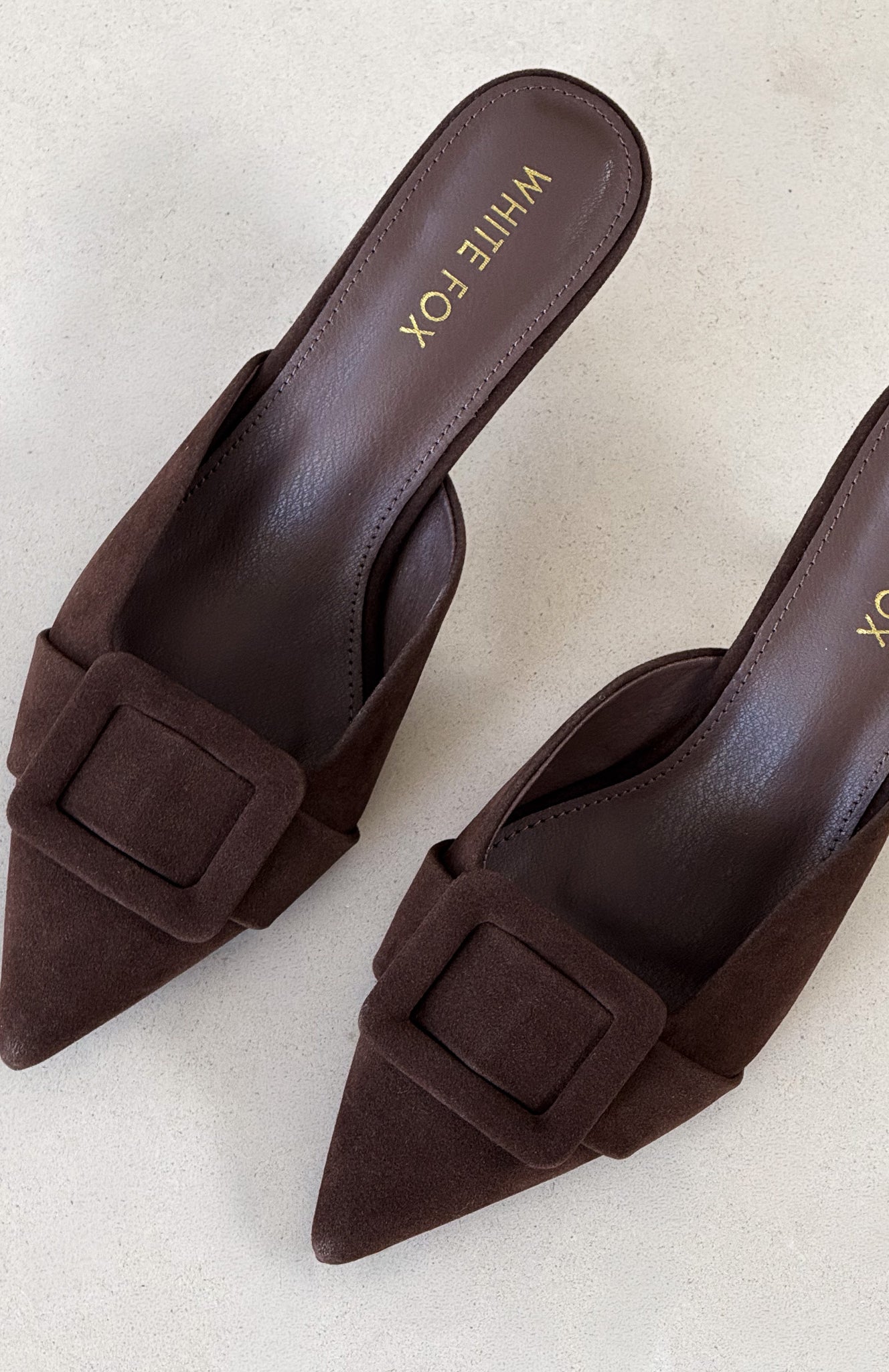 The ones who know. wear them. The Domino Heels in Chocolate Faux Suede feature a pointed closed toe. open round heel. and an oversized buckle at the front atop a chic kitten heel. Style them with denim and a statement top for an effortlessly elevated look.