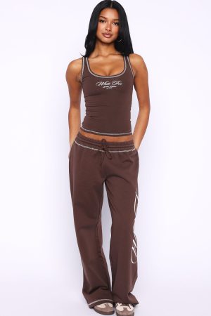 Boss girl energy in the Don’t Need Anyone Track Pants in Chocolate! Features a thick elasticated waistband with an external drawstring tied at the centre front. signature cursive White Fox text down the side of the leg. a flattering wide-leg silhouette and contrast colour hemline stitching for stand-out detail. Pair with the matching Don’t Need Anyone Tank Top for a complete. coordinated look.