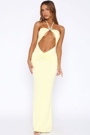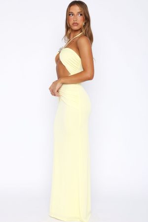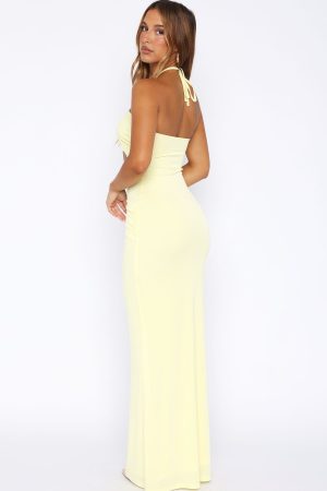 Your search for the perfect birthday dress is over! The Don’t Take Too Long Maxi Dress Lemon will have you at the centre of everyones attention. Features a halter neck design with self tie straps. centre front cut out design with silver butterfly design. maxi length and stretch material.