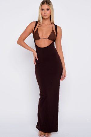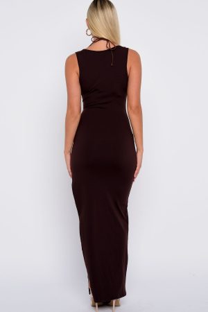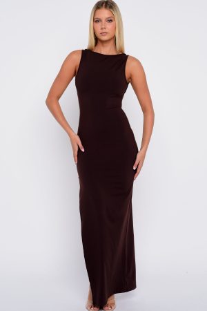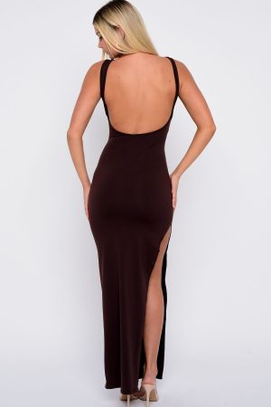 Meet your new favourite maxi: the Don’t Want To Be Apart Maxi Dress in Dark Chocolate. With a sleek high neckline. sleeveless. and a drama-ready open back. it’s crafted from soft fabric that you can even reverse for a plunging silhouette. Perfect with flats and gold accents. it’s your chic answer to every event.