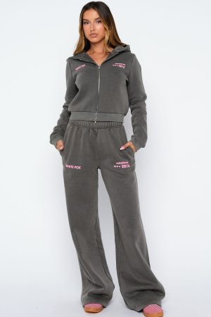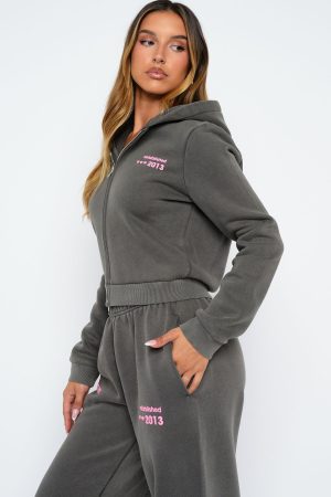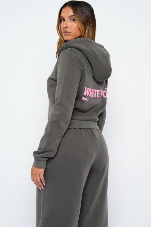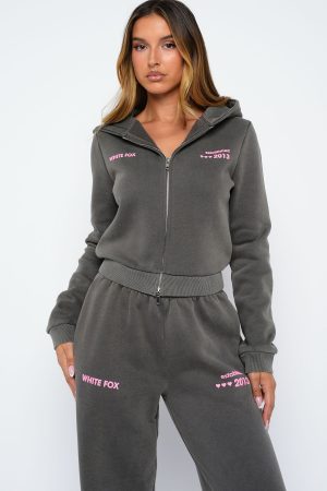 Your new go-to for laid-back luxe. The Down For Whatever Slim Zip Front Hoodie Charcoal Wash is designed with a relaxed hood. slouched shoulders and ribbed hems which round out an slim silhouette. Featuring long sleeves. front zipper closure. and an unlined fleece interior. this hoodie delivers a cozy feel. White Fox embroidered text embellishes the side front. Style with the matching Sweatpants in Charcoal Wash.