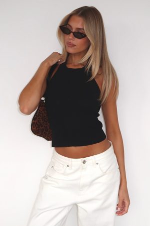 The Downtown Errands Top in Black is a standout basic moment. Features fixed halter neck strap. high scoop neckline and backless with twist fabrication. Make a simple statement by paring with jeans and a colourful shoulder bag.