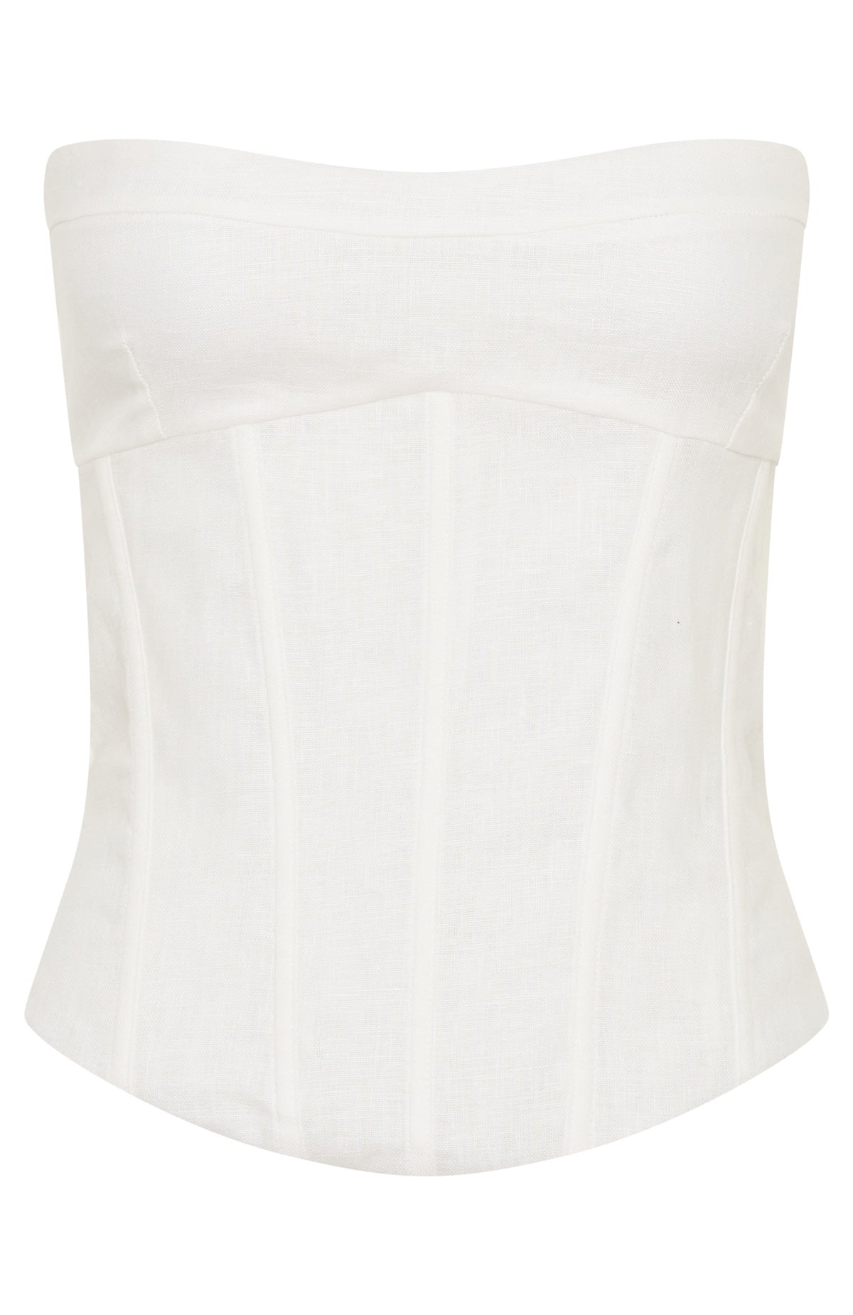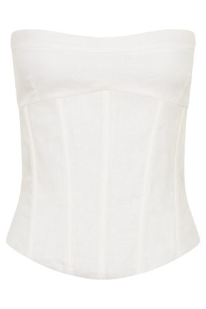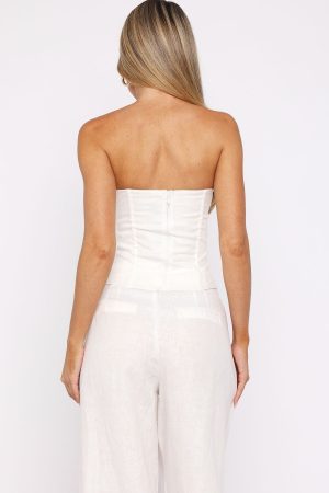 Simple joys. timeless style! The Downtown Pulse Strapless Bustier White features a strapless neckline with grip‑tape support. an under‑bust seam and boning down the bodice for structured elegance. a back zipper with hook‑and‑eye closure and fully lined for comfort. Style with the matching Unfinished Feelings Pants White. sandals and a chic bag for a merry look.