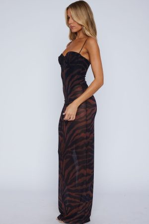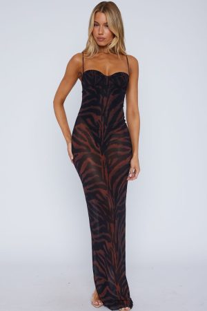 Step into something sexy in the Dream Of Me Maxi Dress in Amber Zebra! Features thin adjustable straps. bust underwire. invisible zipper centre back. built in bodysuit and semi-sheer fabrication. Complete the look with kitten heels and gold accessories for a jaw dropping fit!