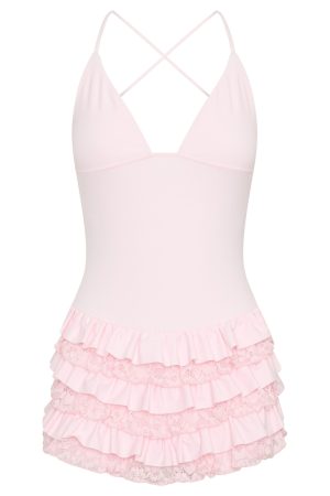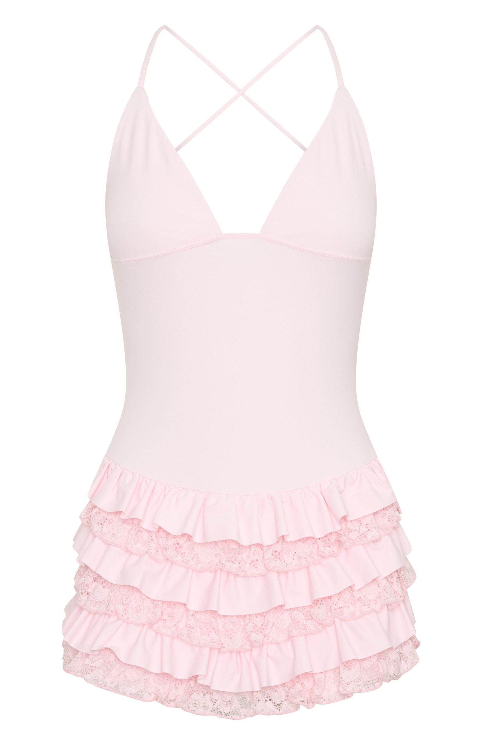 Mosh pit approved! The Dream Of Me Playsuit Baby Pink features thin. adjustable shoulder straps. back lace up closure. sweetheart neckline. lined. built in booty shorts. fitted at bodice. ruffle detailing at skirt and stretch material for an easy slip on design.