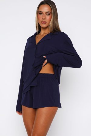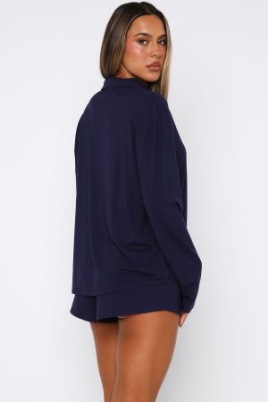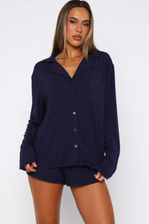 Get cute and cosy in the Dreamscape Long Sleeve Pyjama Set in Navy. Top features a collar neckline. long sleeve and button closure down centre front. Bottoms features a thick elasticated waistband and stretch fabrication for an easy slip on and off. Pair with snug boots and enjoy the night binge watching your fav tv shows!