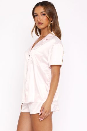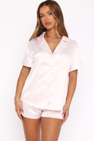 Sweet dreams guaranteed! The Dreamscape Satin Pyjama Set Baby Pink features a two piece pyjama set. collard neckline. front button closure. side pocket. elasticated waistband and soft. silky material.
