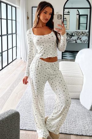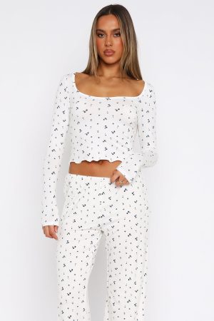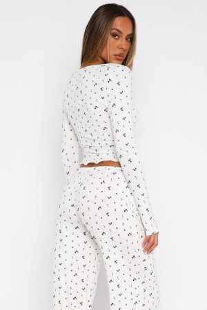 Our cosiest lounge set yet! The Dreamy Long Sleeve Pyjama Top Ditsy Blues features a long sleeve design. semi-fitted. super soft and stretch fabric. low scoop neckline and lettuce cut hemline. Pair with the matching Dreamy Pyjama Shorts or the Dreamy Pyjama Pants for a super cute and cosy look for your next night in!