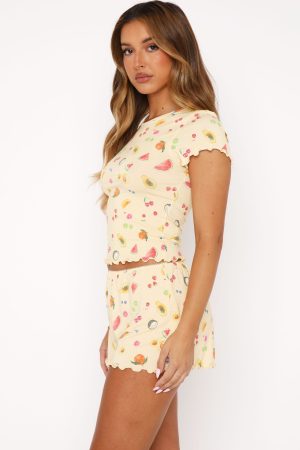 Our cosiest lounge set yet! The Dreamy Pyjama Top Fruit Salad features a short sleeve design. semi-fitted. super soft and stretch fabric. high scoop neckline and lettuce cut hemline. Pair with the matching Dreamy Pyjama Shorts or the Dreamy Pyjama Pants for a super cute and cosy look for your next night in!