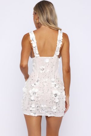 Wife of the Party in the Dreamy Together Embellished Mini Dress in White. Features thick shoulder straps and a flattering plunge V-neckline. a fitted silhouette that sparkles with floral. sequin. and beaded embellishment for standout bridal glamour. It’s fully lined with a mesh base and fastens with an invisible side zipper and hook-and-eye closure. Style it with simple heels and delicate gold jewelry for all eyes on the bride.