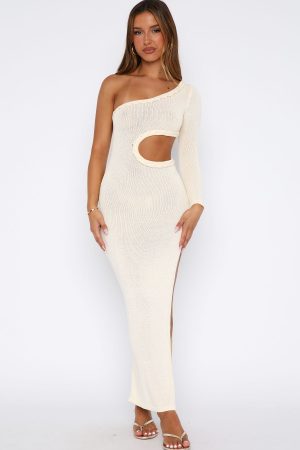 Let the Dusk To Dawn Knit Maxi Dress Cream take your holiday insta posts’ to the next level! Features a one shoulder design with long sleeve. centre cut out detailing. textured trim detailing. maxi length. high side split. and unlined. slightly sheer. stretch material. Pair with layered gold accessories and a kitten heel!