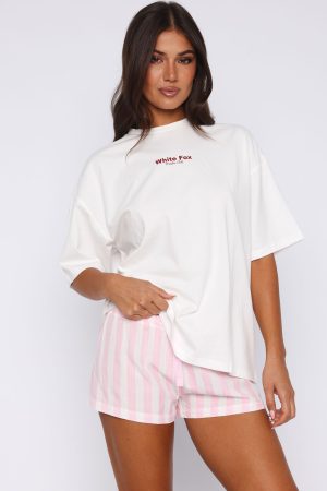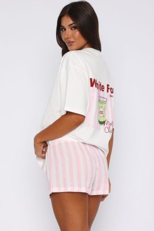 Gals listen up! The Echoes Of You Pyjama Shorts Pink/White in White is about to become your newest obsession. Features a thin elasticated waistband with drawstring ties and the most cutesy stripe print. Start your morning right with a matcha in hand and the Matcha Club Pyjama Oversized Tee in White.