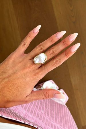 Make a bold statement with the Electra Ring in Gold. Features a thick. polished gold band crowned with an irregular pearl encased in gold. It demands attention and elevates any summer outfit with its unique elegance.