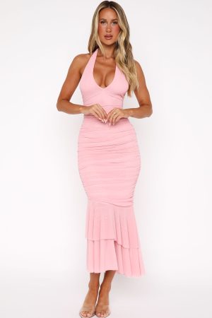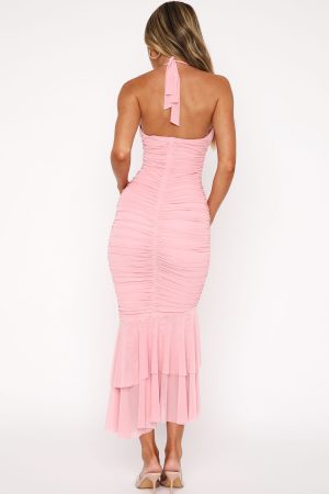 Feel an instant connection in the Electric Love Halter Midi Dress Baby Pink. Featuring a halter neck design with self tie strap. low plunge sweetheart neckline. lined. side ruching detailing. invisible back zipper and clasp closure. slight stretch material and layered hem detailing. We are obsessed!