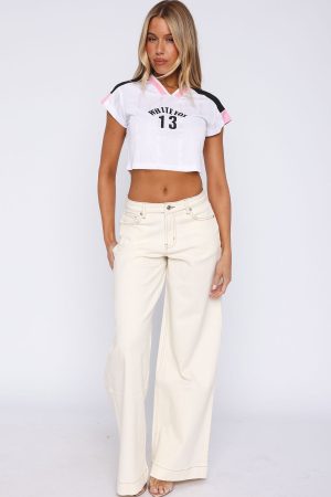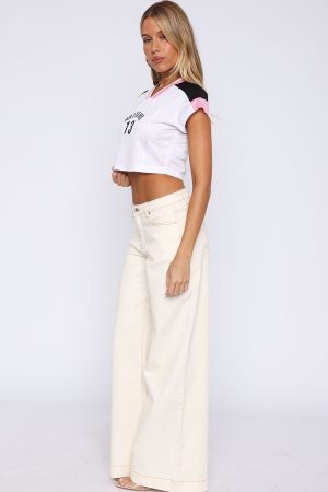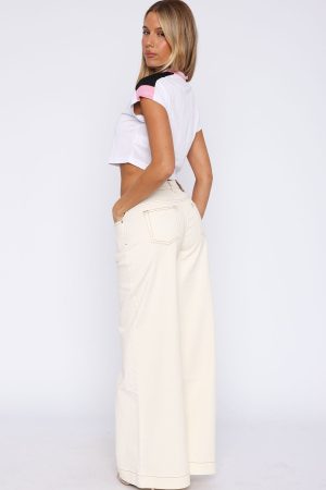 We are officially obsessed with the Elena Low Rise Wide Leg Jeans in Cream! Features low rise waist cut. button and zipper closure. 5 pockets. belt buckle holes. wide leg and White Fox Logo side back. Complete the look with a elevated basic and kitten heels for the perfect Sunday brunch look.