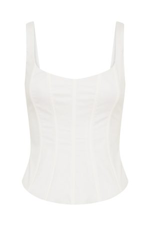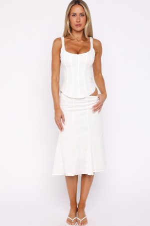 Santa’s favourite! The Empire Energy Bustier White features thick shoulder straps. a flattering scoop neckline. structured internal boning down the bodice. a secure back zipper with hook-and-eye closure. and is fully lined for a flawless finish. Style with the matching Empire Energy Midi Skirt White. heels and chic layered gold jewellery.