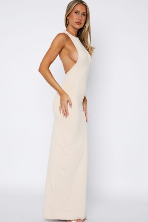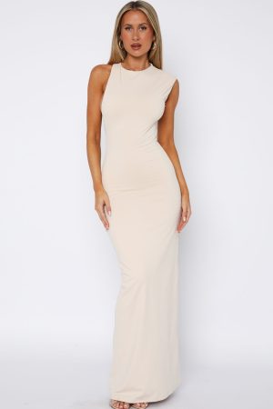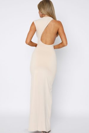 We have fallen in love! The Endless Love Maxi Dress in Bone features a jewel neckline. statement asymmetrical cut out design on side back and stretch fabrication for an easy slip on design. Achieve the perfect blend of chic and sexy by pairing with kitten heels and statement earrings!