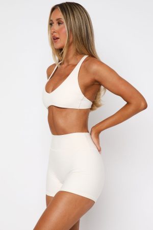 For all your practice and plans. the Energize Me Sports Bra Cream will be your go-to. Features a plunge neckline. thick stretch straps. fitted design. criss-cross back design. lined. removable padding and WFA logo at back. Pair with one of the matching Won’t Give Up Cross Front Shorts for a look we are loving!
