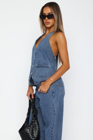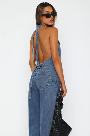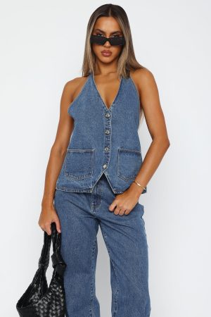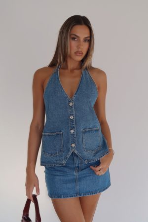 The set of our denim dreams! The Energy Balance Top Admiral Blue features a halter style neckline with self-tie straps. plunge v-neckline. button through front design. denim fabric. sleeveless. open back design. tie fastening closure at back and front pockets. Pair with the matching Momentum Mid Rise Straight Leg Jean or the Holla At Me Mini Skirt for a look we’re loving right now!