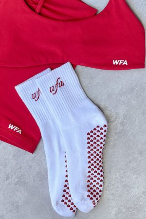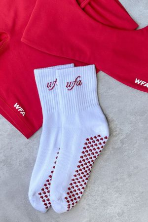 Your pilates fit isn’t complete without the Energy Is Infinite Grip Socks White/Red! These cushioned crew socks feature embroidered WFA Logo. grip sole and ribbed ankle cuffs and arch band.