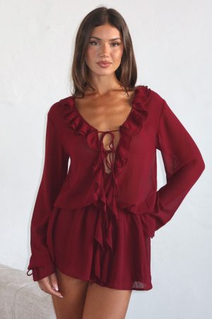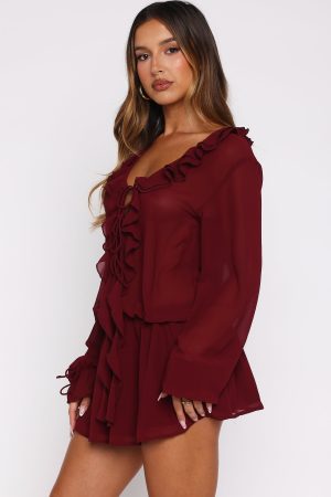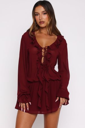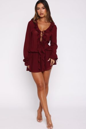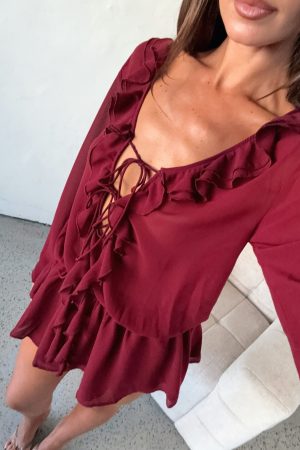 Float through life in our Eternal Energy Long Sleeve Mini Dress in Burgundy! A soft V‑neck trimmed with delicate ruffles sways into long sleeves with elasticated cuffs and chic tie closures. The elasticated waist gives shape. while a fully lined mini skirt ensures comfort that moves with you. Style with statement heels and layered gold jewellery for an effortless fit!