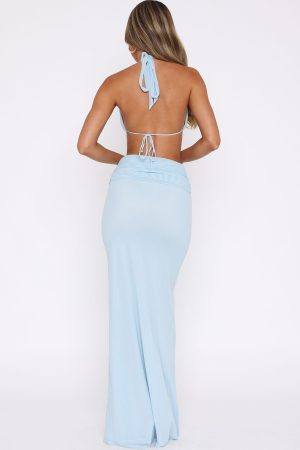Sleek and sexy vibes only… The Everybody’s Watching Maxi Dress Baby Blue features a halter neck design with self tie . ultra low plunge neckline. front cut out detailing with knot design. backless. maxi length and lined fabric. Pair with kitten heels and high shine accessories!