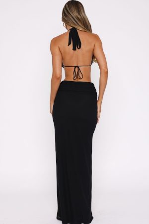 Sleek and sexy vibes only… The Everybody’s Watching Maxi Dress Black features a halter neck design with self tie . ultra low plunge neckline. front cut out detailing with knot design. backless. maxi length and lined fabric. Pair with kitten heels and high shine accessories!