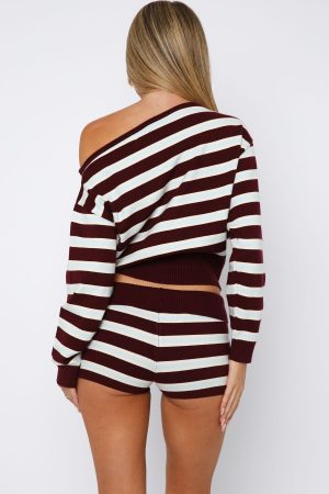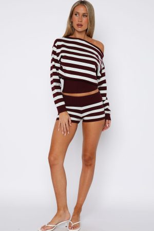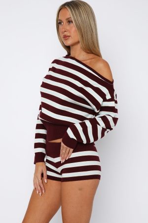 Perfect for layering – introducing the Everything To Everybody Sweater in Burgundy Stripe! Features an off the shoulder neckline. long sleeve with ribbed cuffs and thick ribbed waistband for a cinched fit! Have a matching moment by pairing with the Everything To Everybody Booty Shorts Burgundy Stripe.