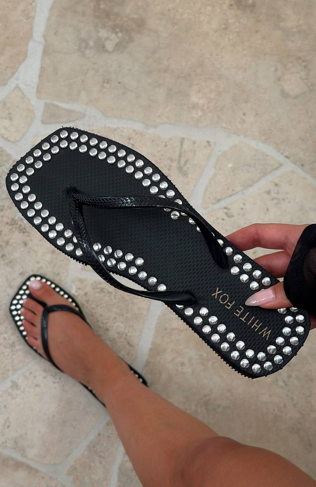 Step into summer style with the Eyre Studded Thong Sandals in Black. These chic sandals feature a bold square toe and eye catching studded design that adds an edgy twist to any casual look. Perfect for beach days. weekend outings. or laid back adventures. they’re the perfect statement piece!